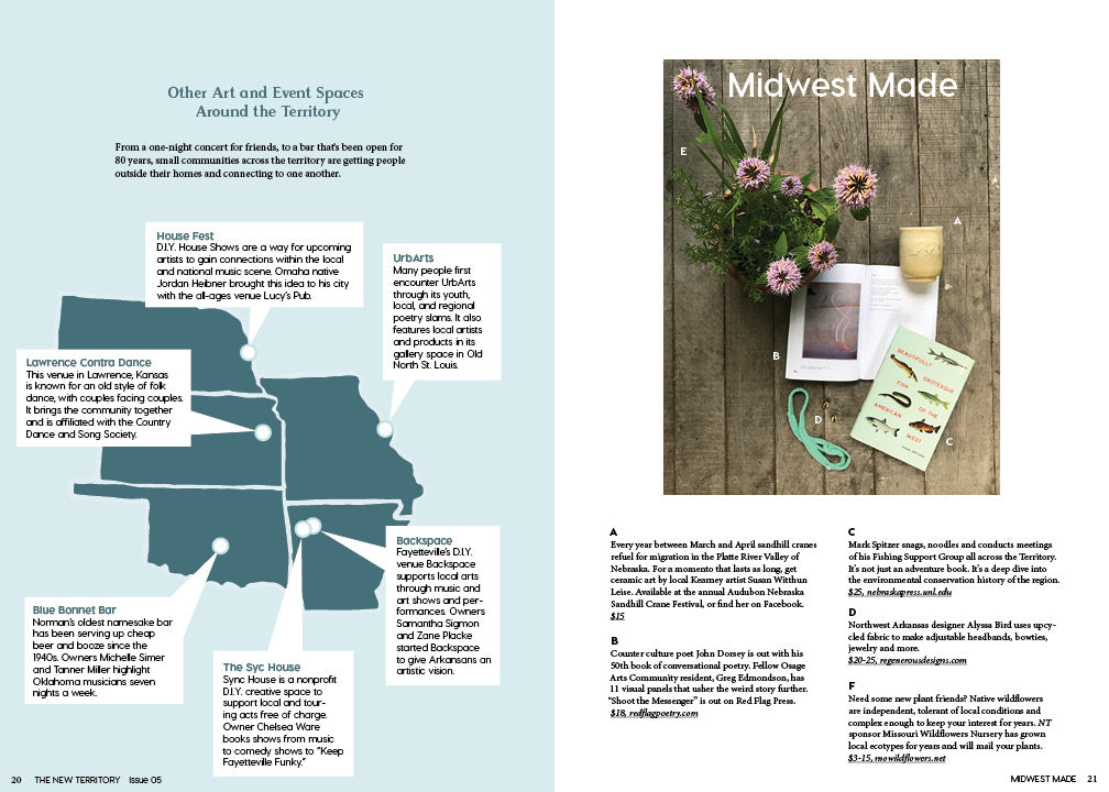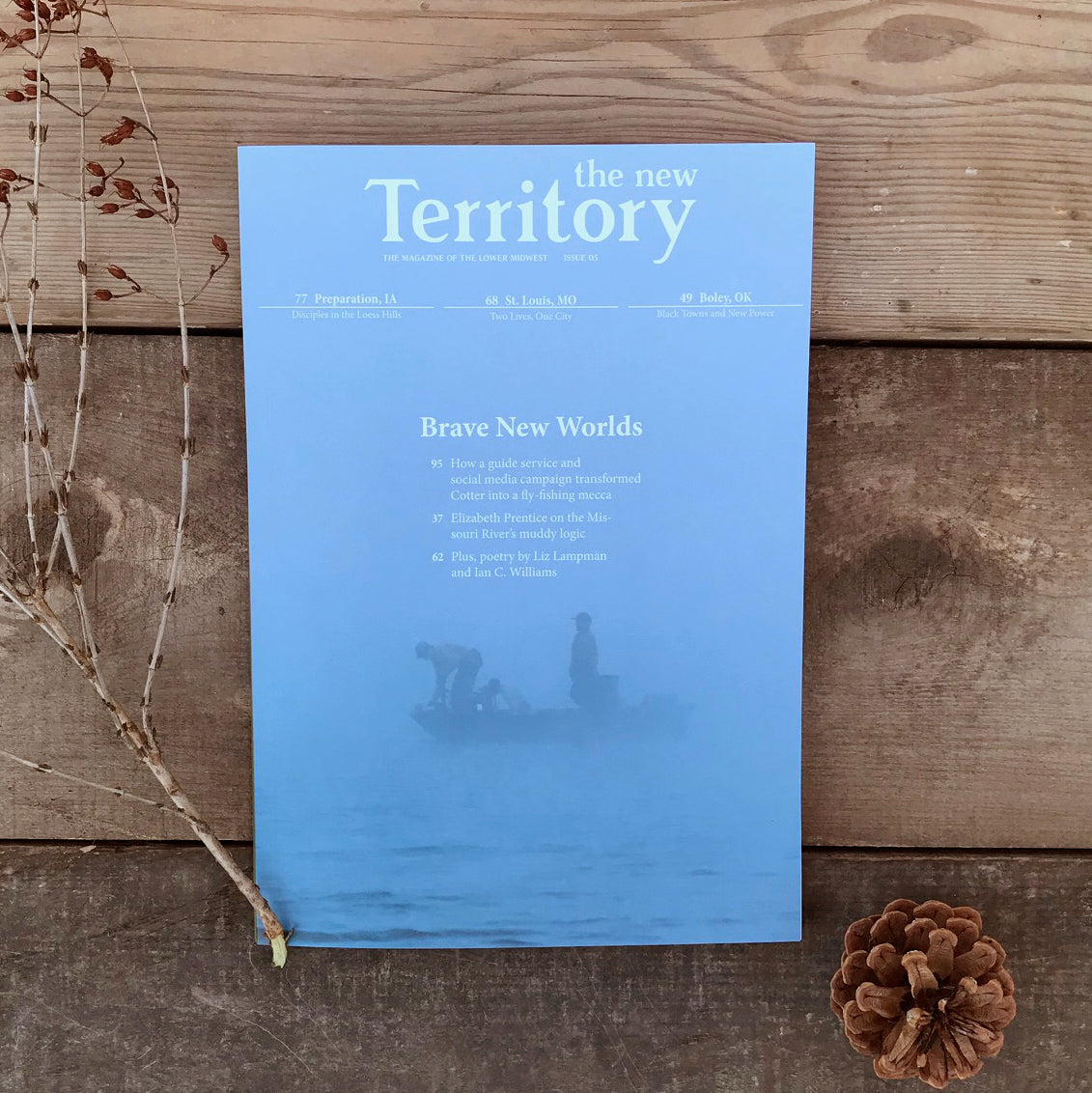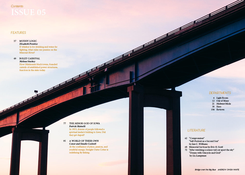 The stories in Issue 05 meet at the confluence of place, people, and passion. Ellie Prentice presents a deeply thoughtful reflection on the Missouri River’s muddy logic, while Kat Wilson’s Habitats series of photos form a portrait of a very diverse Arkansas. We take you through brave new landscapes, from fly-fishing on the White River, to a Juneteenth celebration in historically Black towns in Oklahoma. We go on a wild, criminal ride on a Bobcat trailer and visit the loess hills of Iowa, where a “minor god” duped dozens of his followers and puzzles pilgrims to this day.
