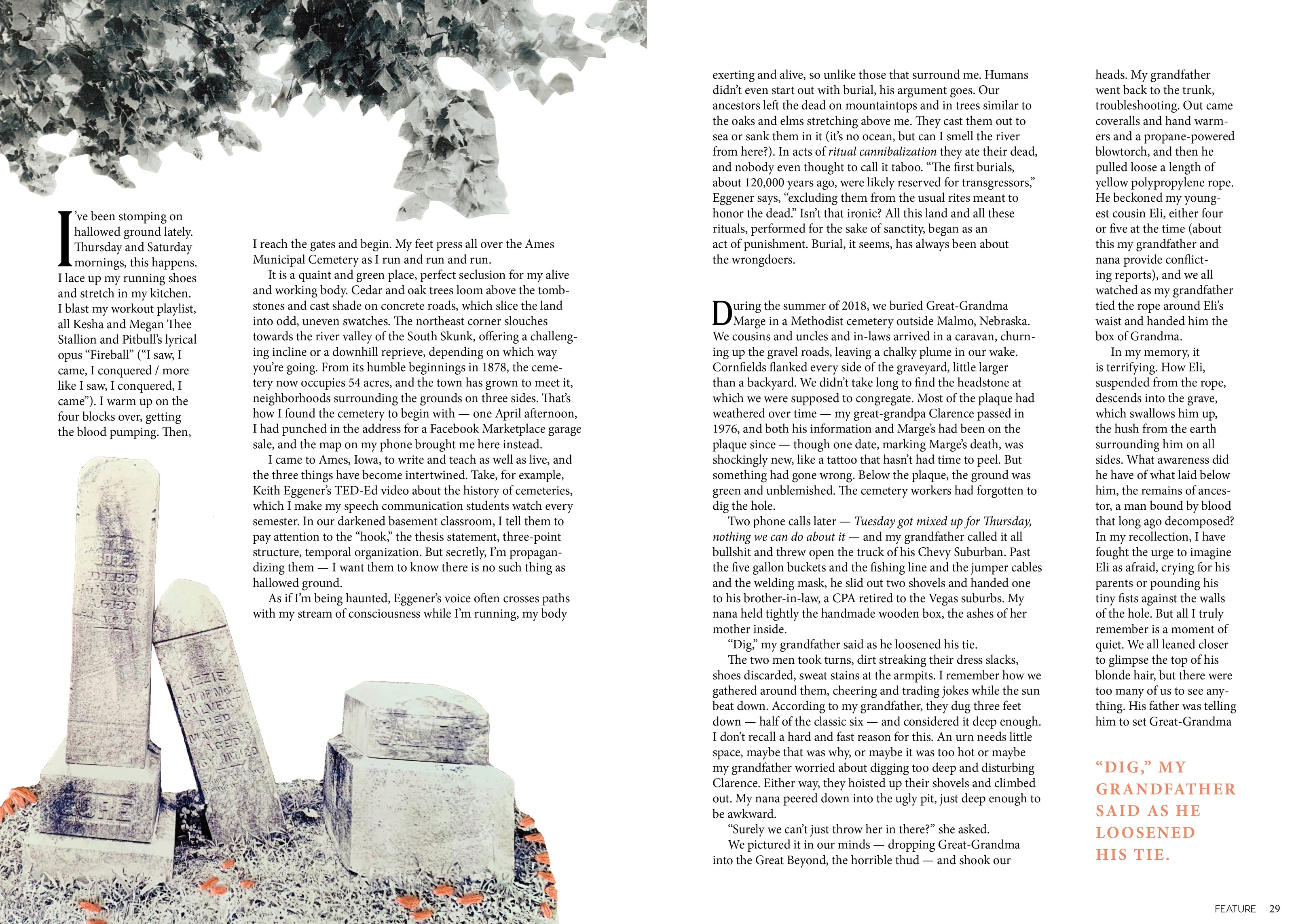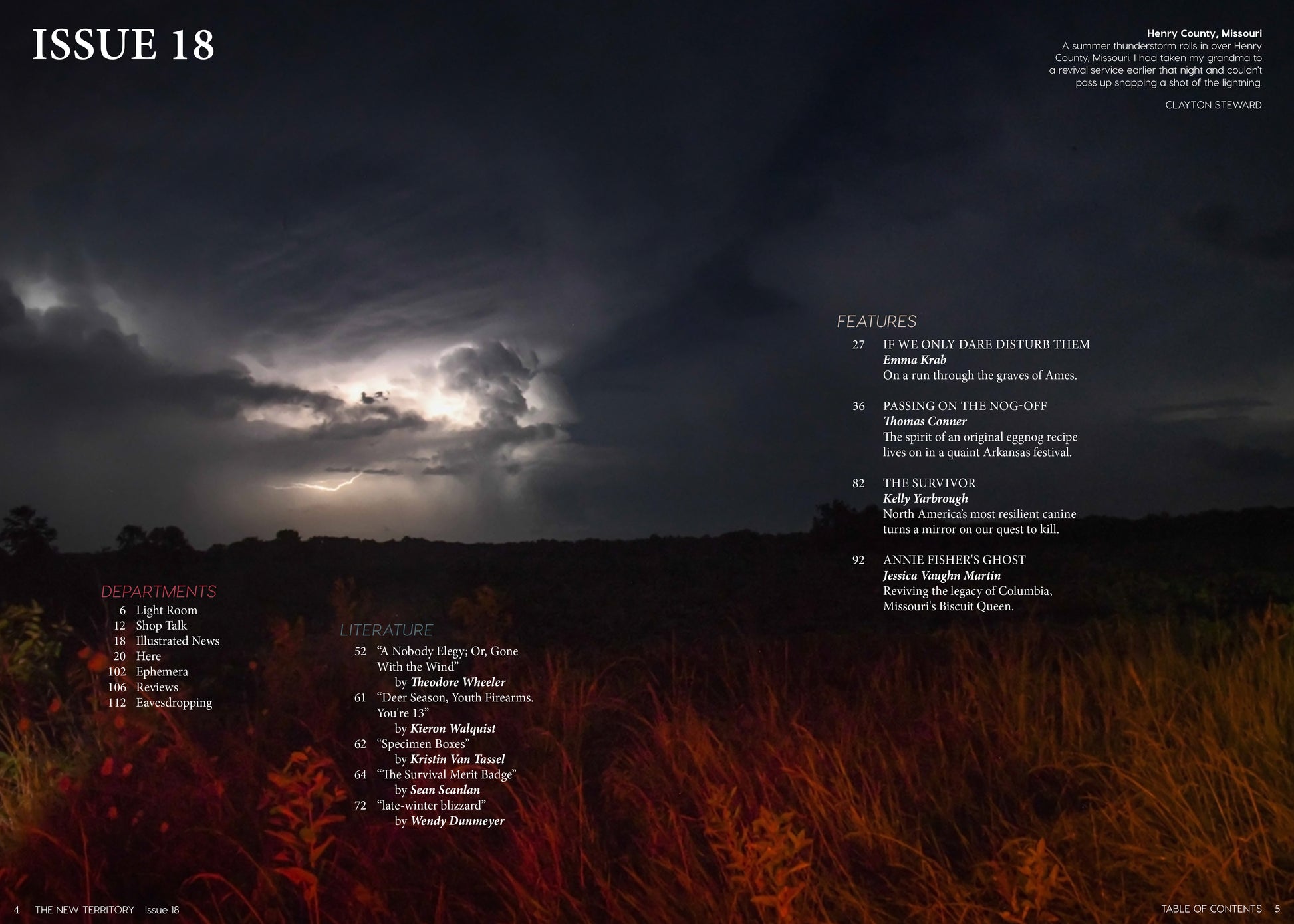 A run through the graves of Ames. A search for bones - and answers - on the Kansas prairie. An heirloom eggnog recipe and a biscuit baroness. Haunting and tender, Issue 18 tends to the stories of our region.